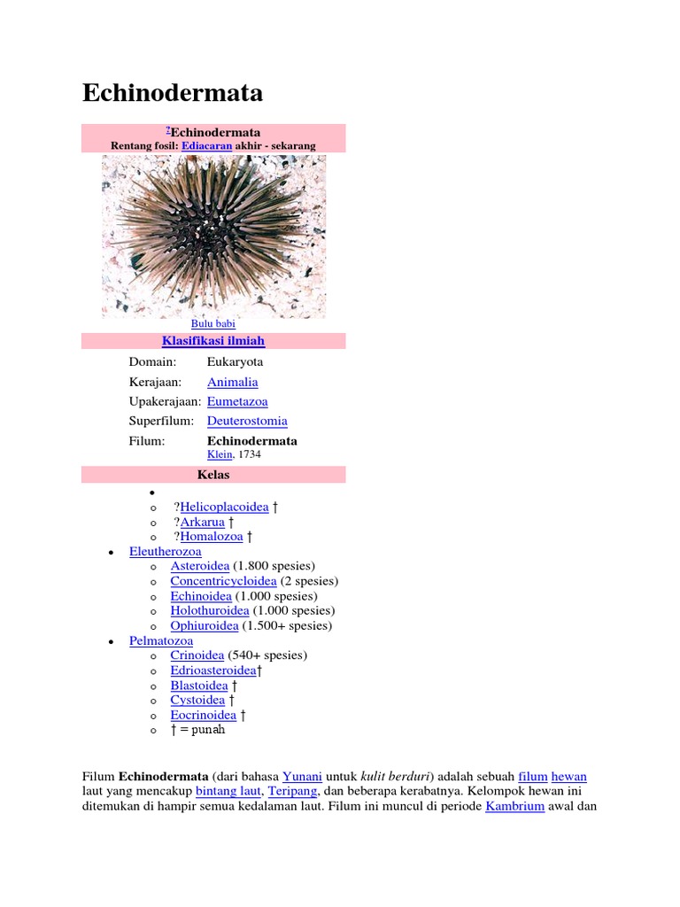 Filum Echinodermata from cdn.slidesharecdn.com Temukan 15 spesies hewan dari filim echinodermata yaitu di temukan 4 spesies bintang laut, 3 spesies bintang ular, 2 spesies bulu babi, 1 spesies dolar pasir, dan 5 spesies teripang. Beberapa spesies dari kelompok echinodermata seperti bulu babi dan teripang biasanya dicari oleh masyarakat karena memiliki nilai ekonomi dan protein yang tinggi. Echinodermata merupakan invertebrata laut yang memiliki tubuh berduri dan simetri pentaradial. Sementara itu, bulu babi diperdagangkan untuk dimanfaatkan gonadnya. Hewan bulu babi, bintang laut, teripang dan lili laut termasuk kedalam salah satu filum karena memiliki persamaan ciri,yaitu? Sedangkan filum chordata memiliki anggota yang paling mencolok, yakni vertebrata. Dari contoh yang disebutkan diatas, maka dapat kita simpulkan bahwa: Spesies dari bulu babi ini ada.